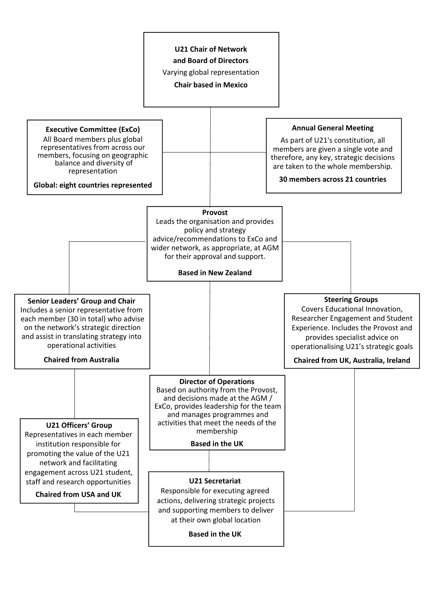 Professor Jenny Dixon, Provost of Universitas 21 leads our organisation with oversight and governance from the Executive and Board, led by Professor David Garza, Chair of Universitas 21 and President of Tecnologico de Monterrey. A full governance model is provided below.